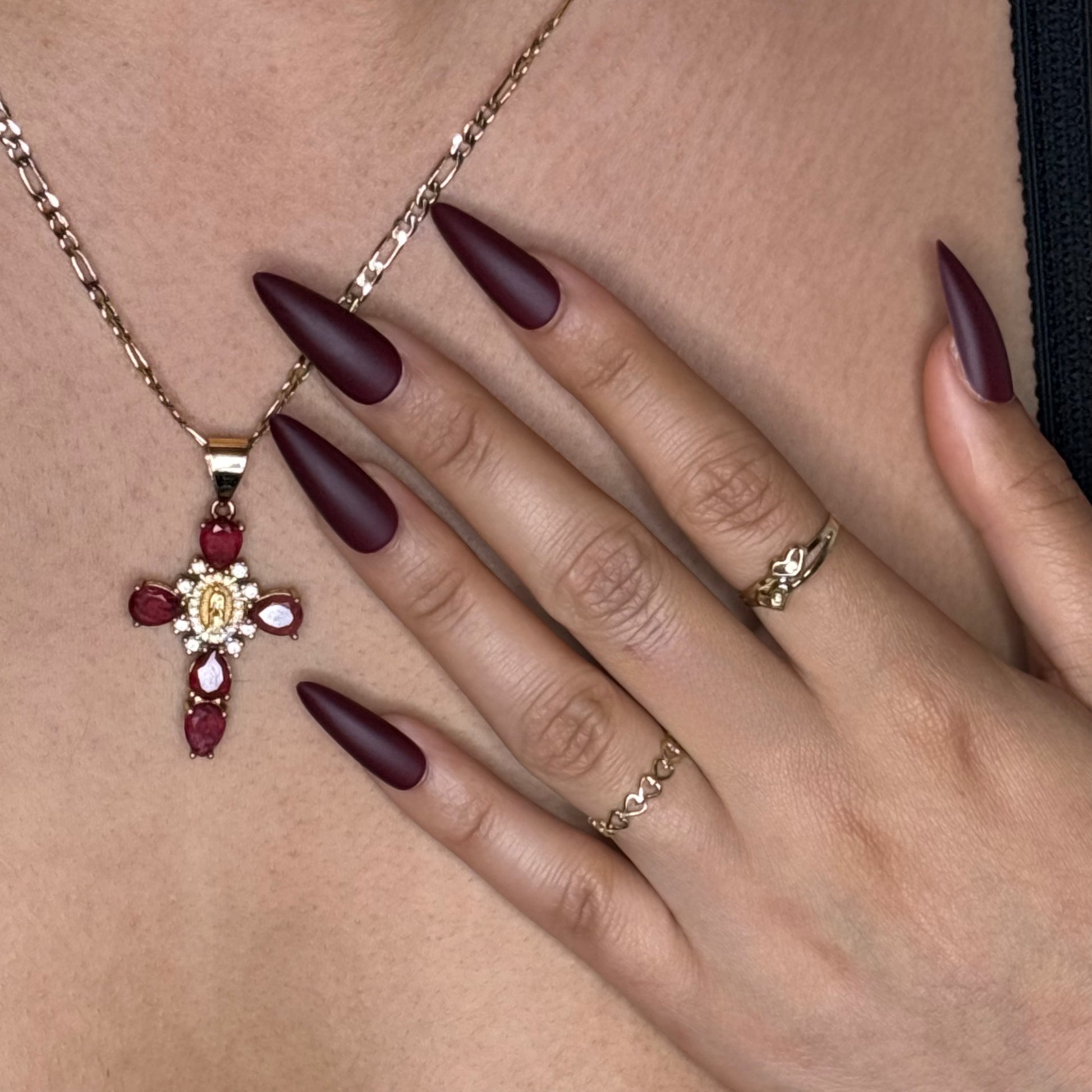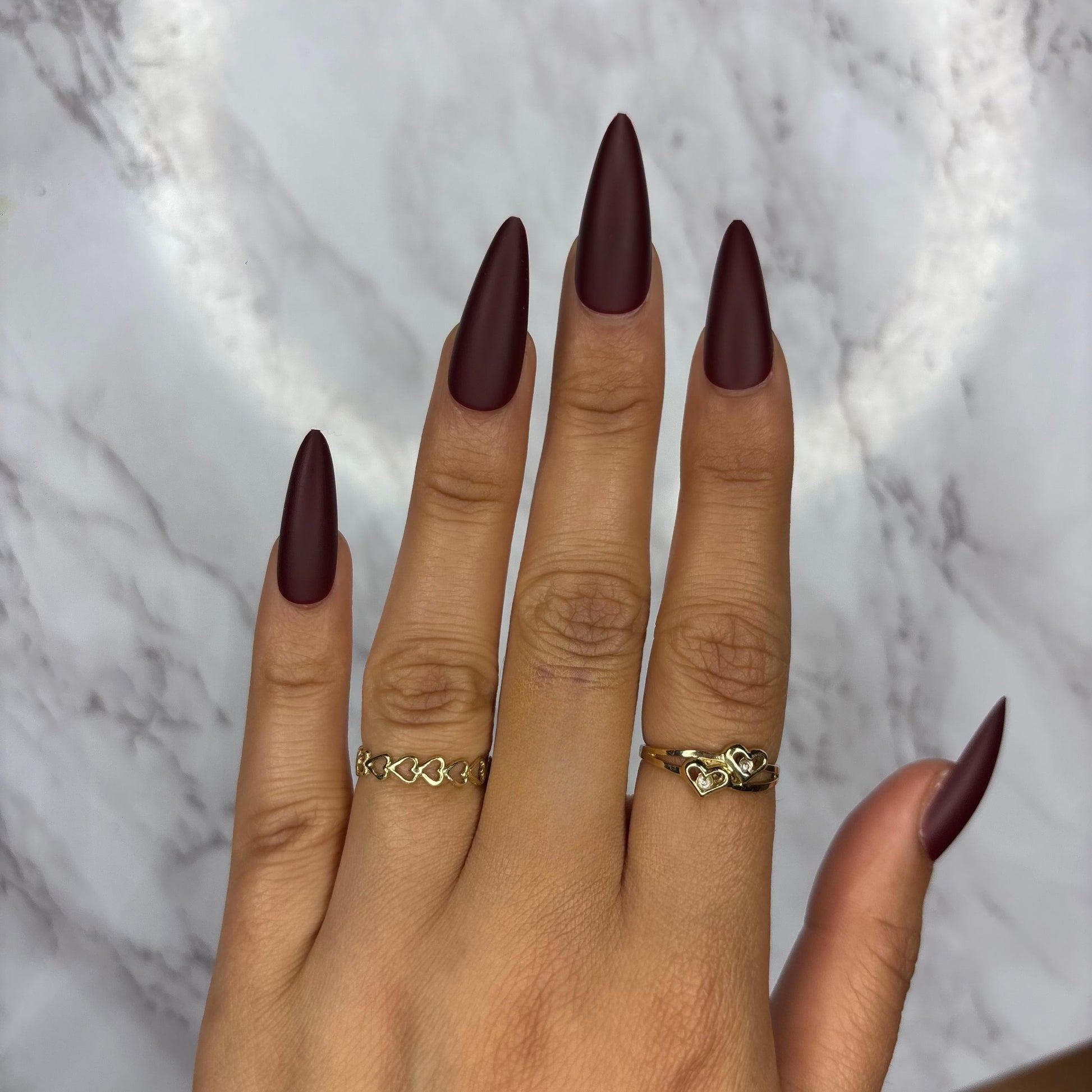 BURGUNDY BOSS is a long stiletto nail set in a rich, deep burgundy with a matte finish, exuding bold elegance.