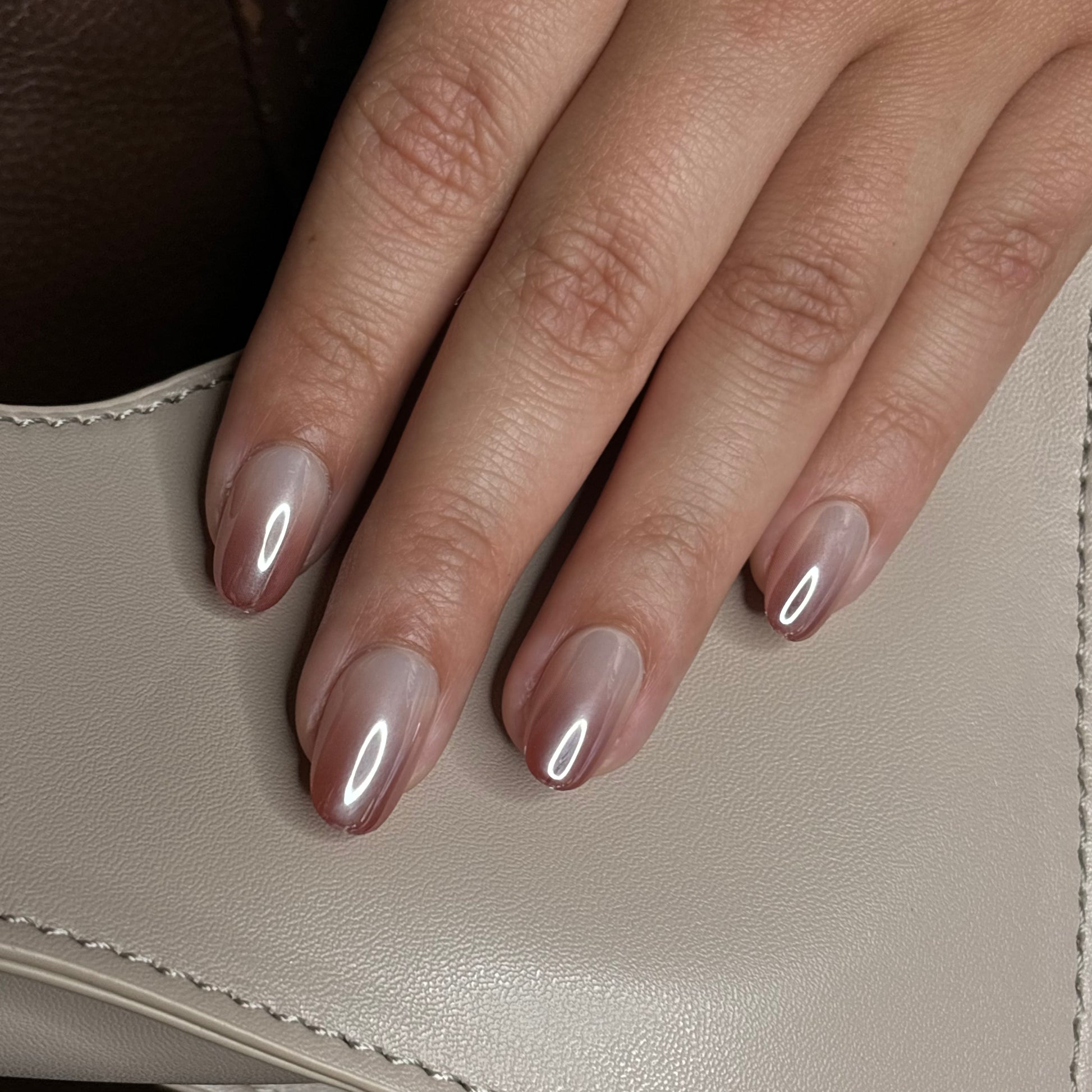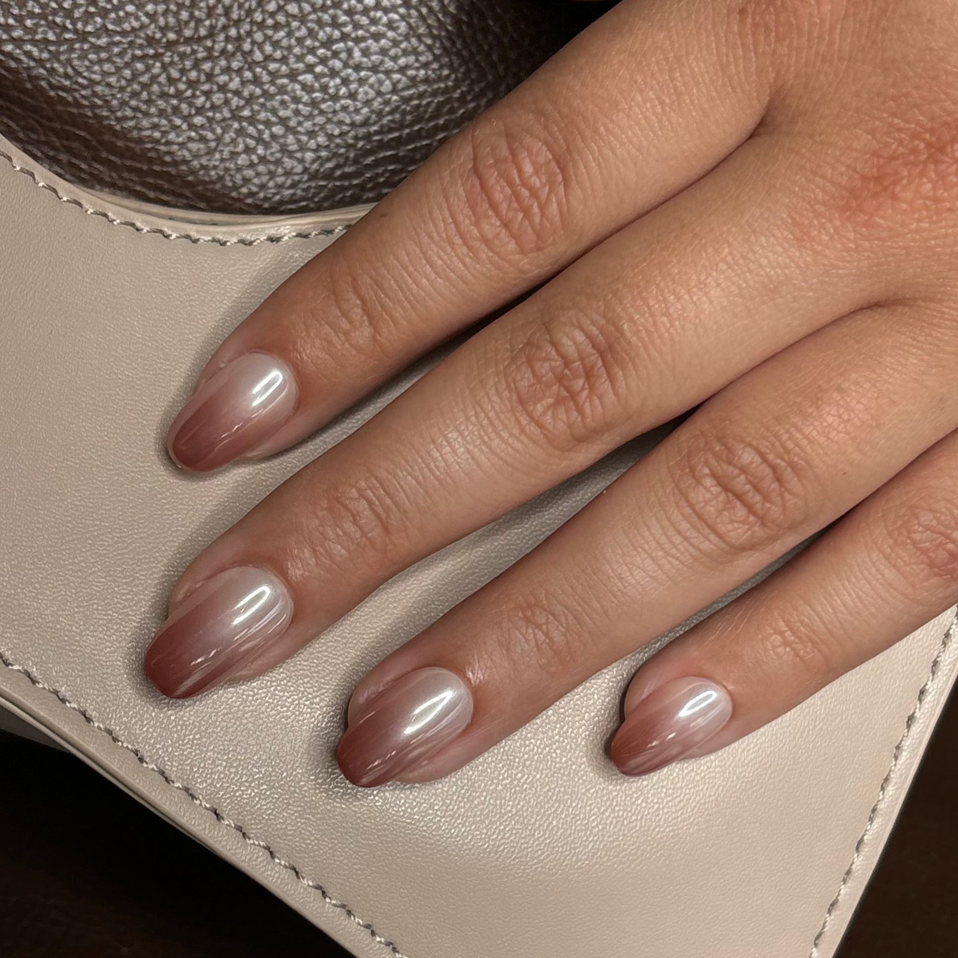 CARAMEL GLAZE is a short, round nail set with a rich caramel ombré tip and a pearly chrome finish for a warm and luxurious look.