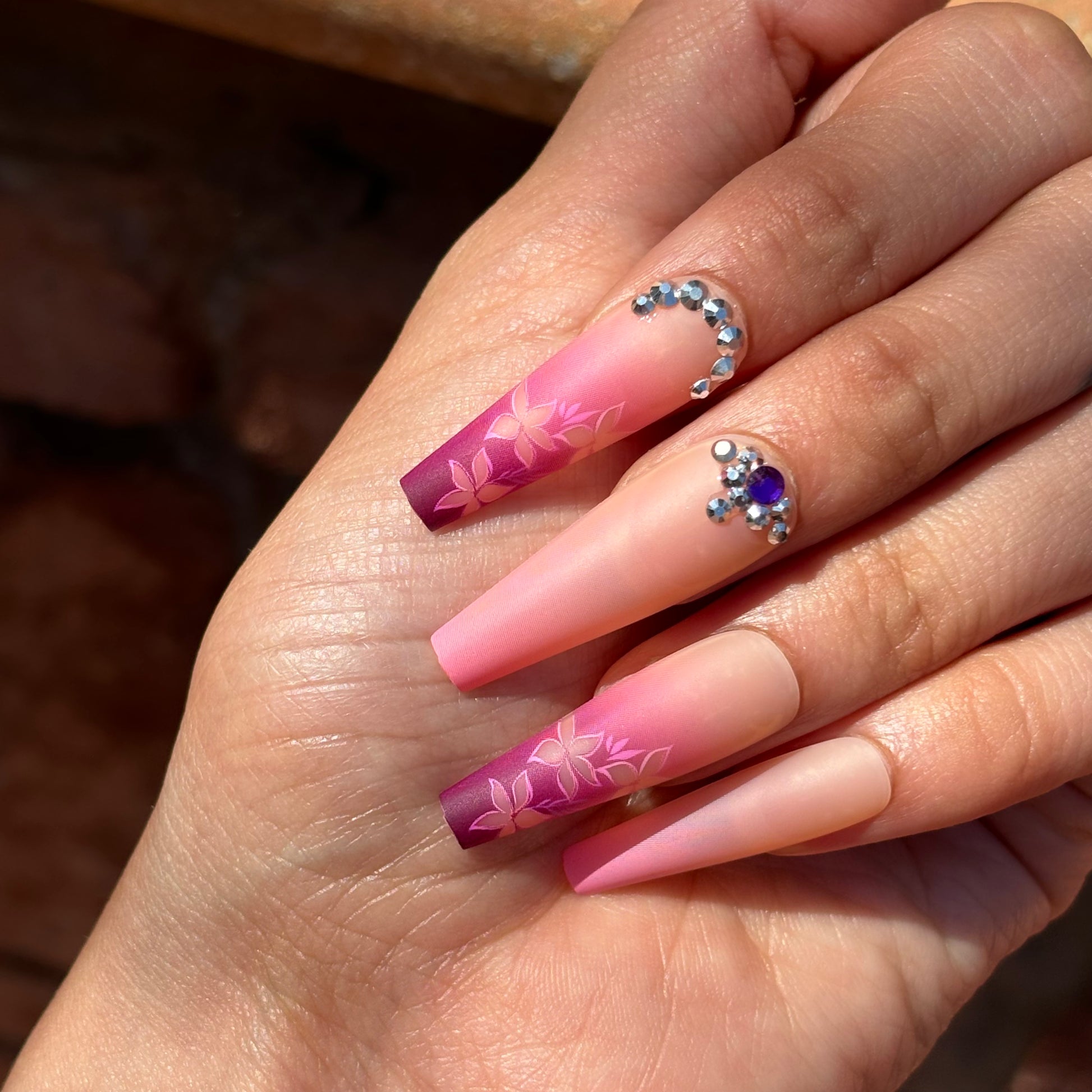 FLOWER BOMB is an extra-long coffin-shaped nail set with a nude base adorned with a vibrant purple exotic flower design and sparkling rhinestones, finished in a chic matte for a bold and fun look.