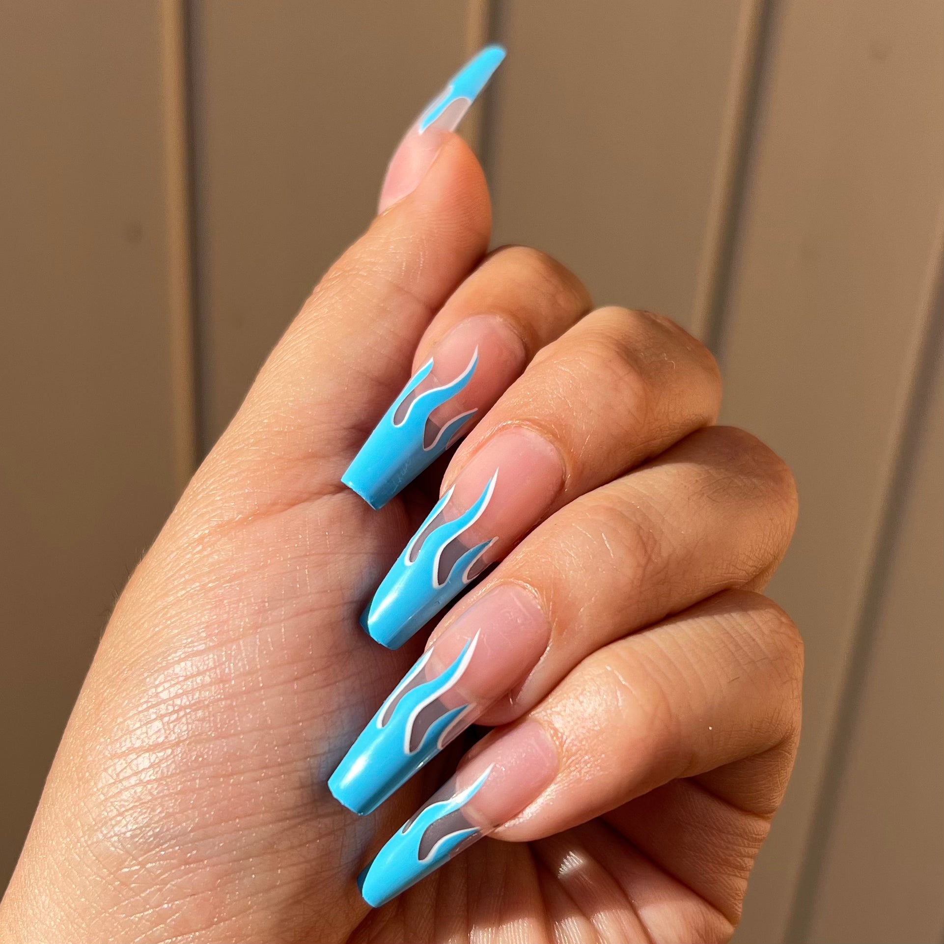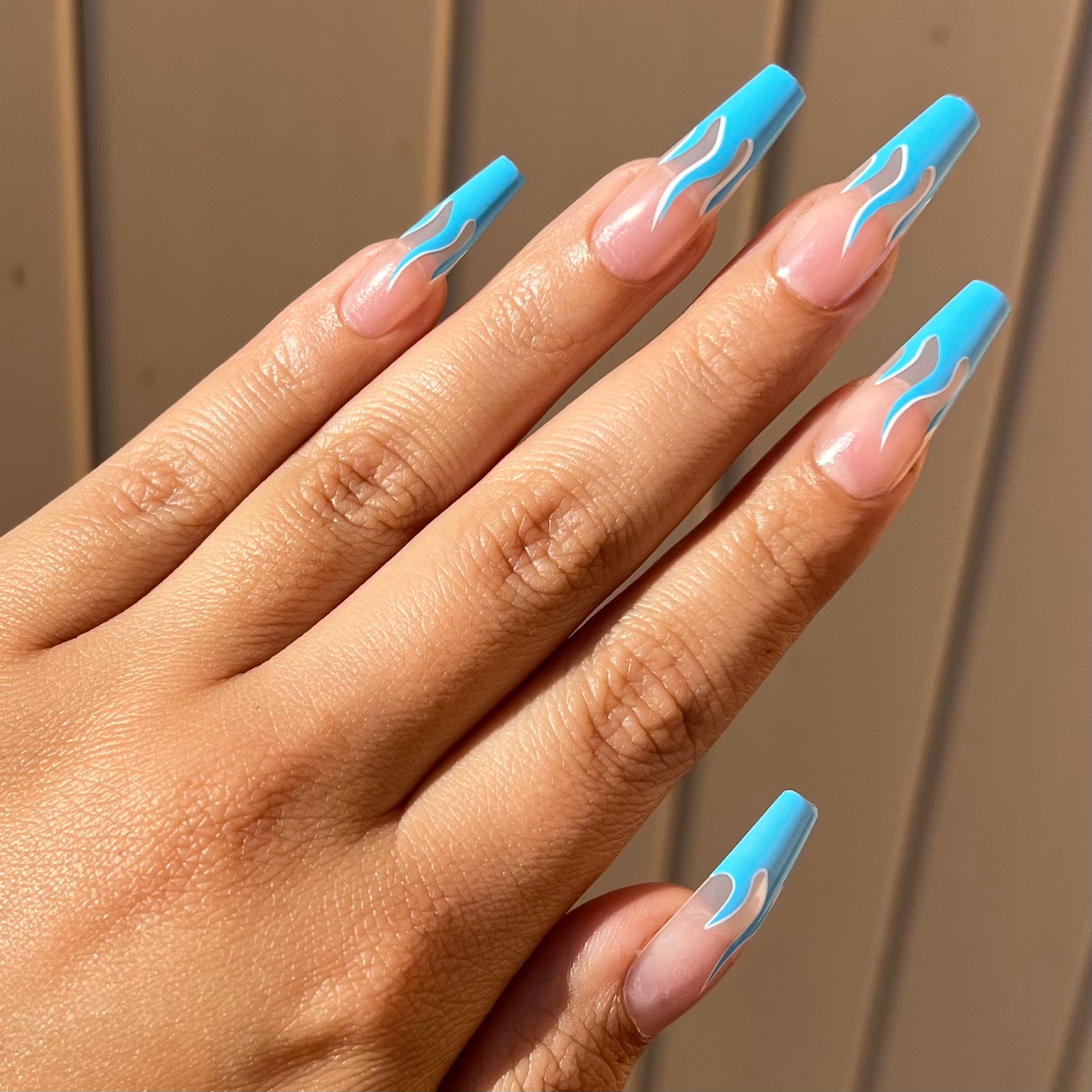 OCEAN FLAME is an extra-long coffin-shaped nail set with a clear base and bold blue flame tip design, finished with a glossy shine for a fierce, standout look.