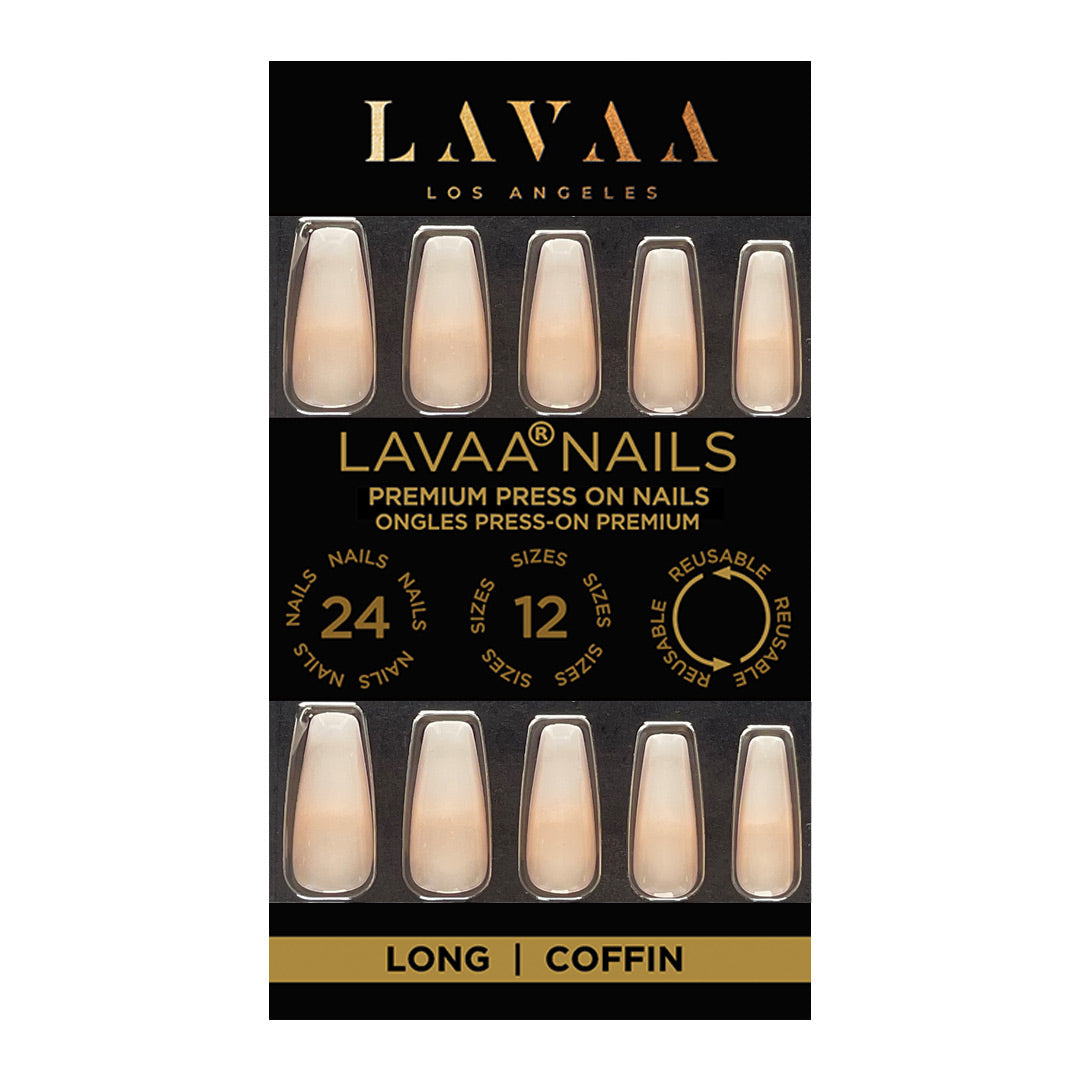OMBRE FRENCH is a long coffin-shaped nail set with a nude base and a gorgeous ombré French tip, finished with a glossy shine for an elegant and timeless look.