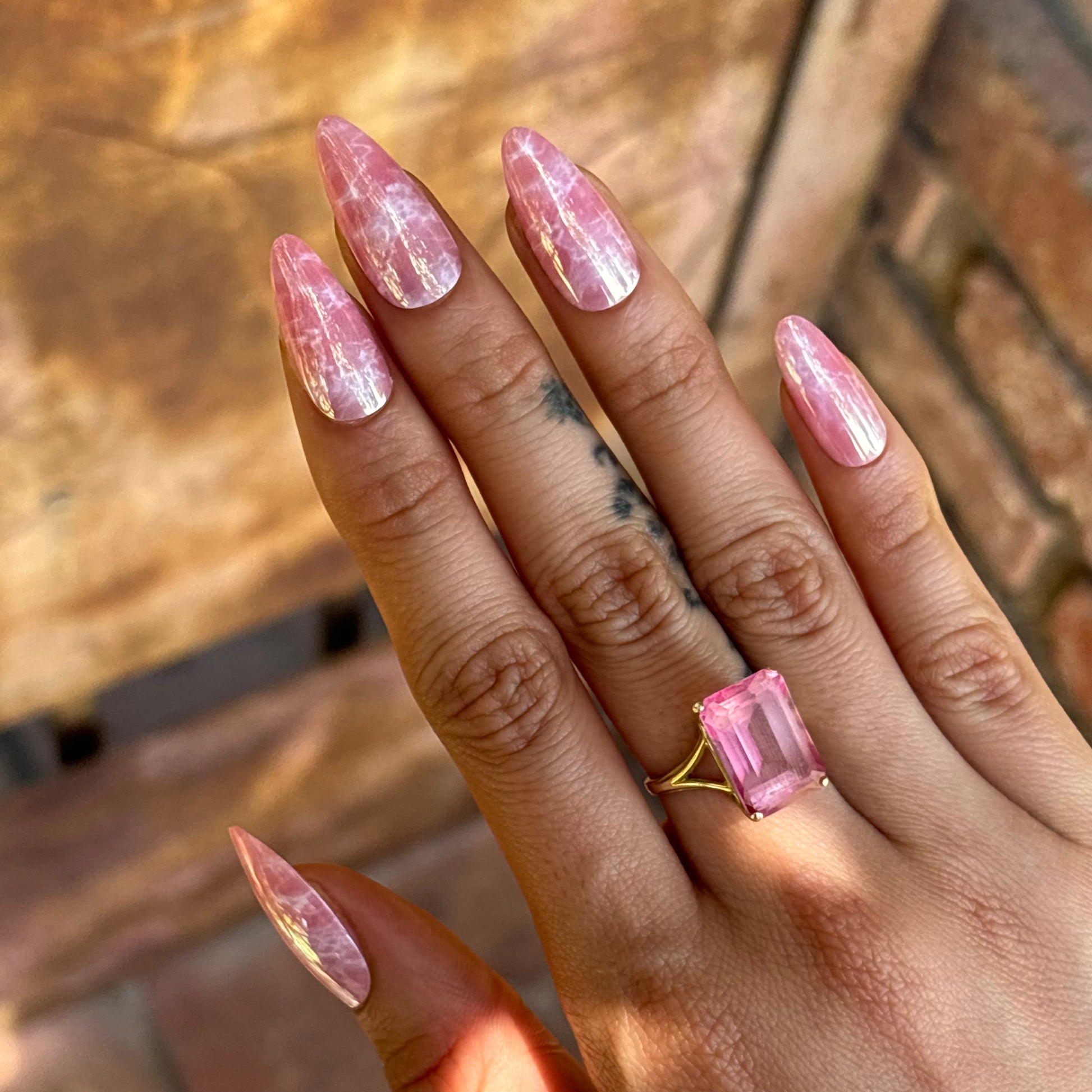 PINK MARBLE is a medium almond-shaped nail set with a sheer pink base and a glossy chrome marble pattern, perfect for a sophisticated, stylish look.