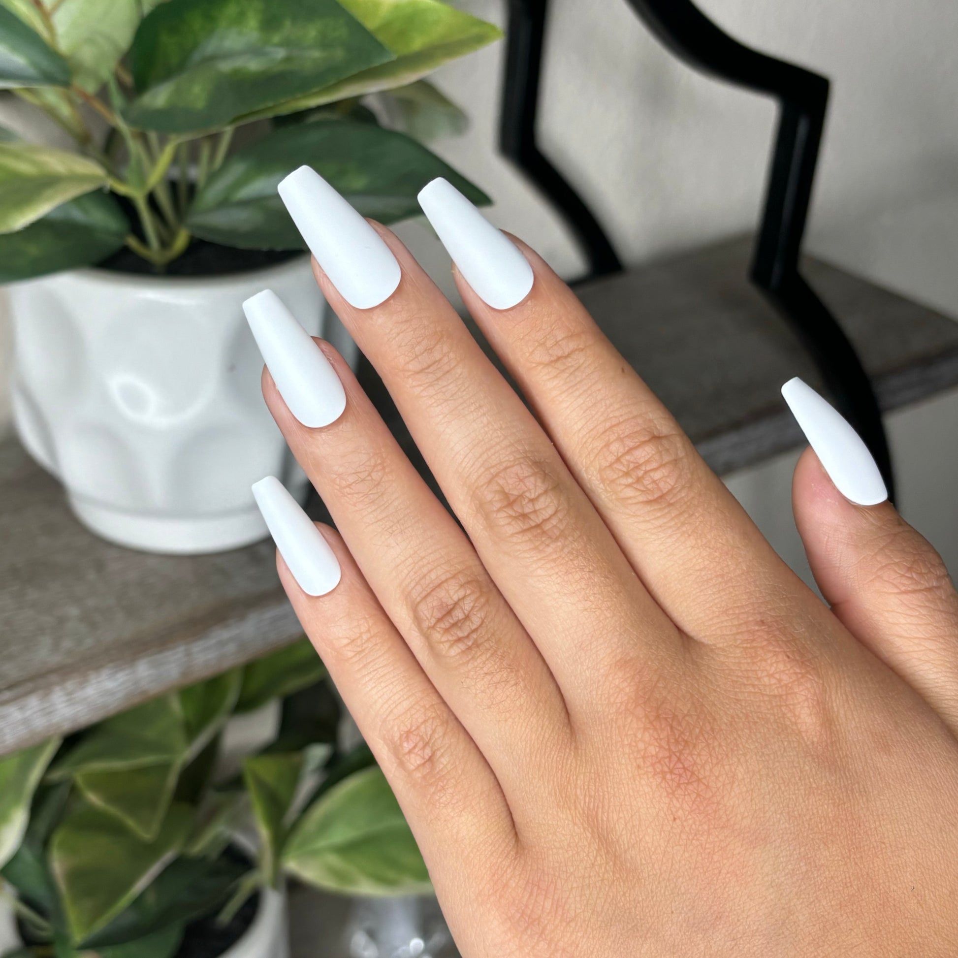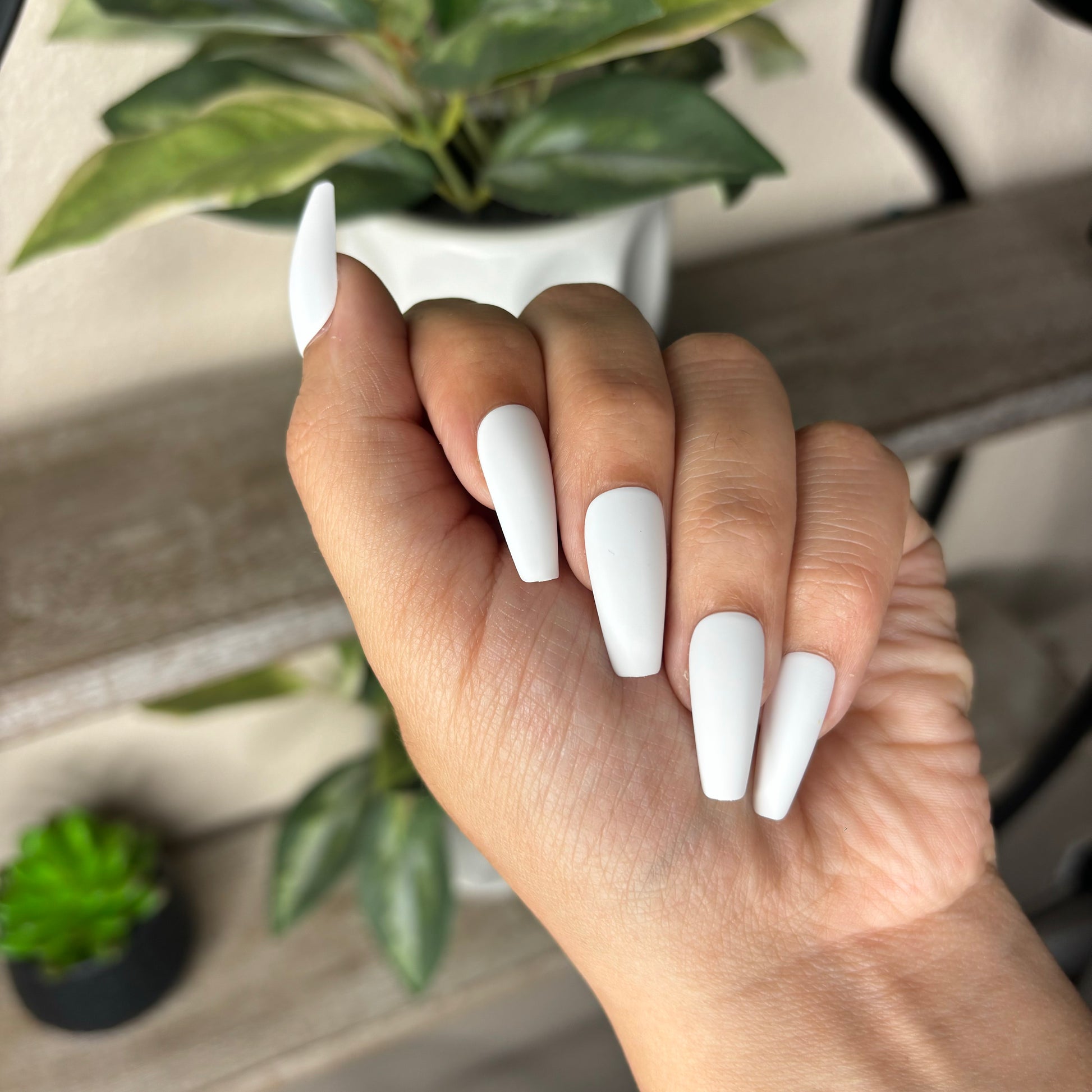 WHITE COFFIN is a long coffin-shaped nail set with a bold, bright white matte finish for a sleek and modern look.