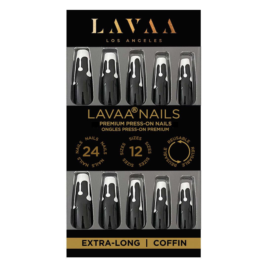 WHITE DRIP is an extra-long coffin-shaped nail set featuring a black base with a white paint drip tip design and a glossy finish, creating a striking, edgy style.